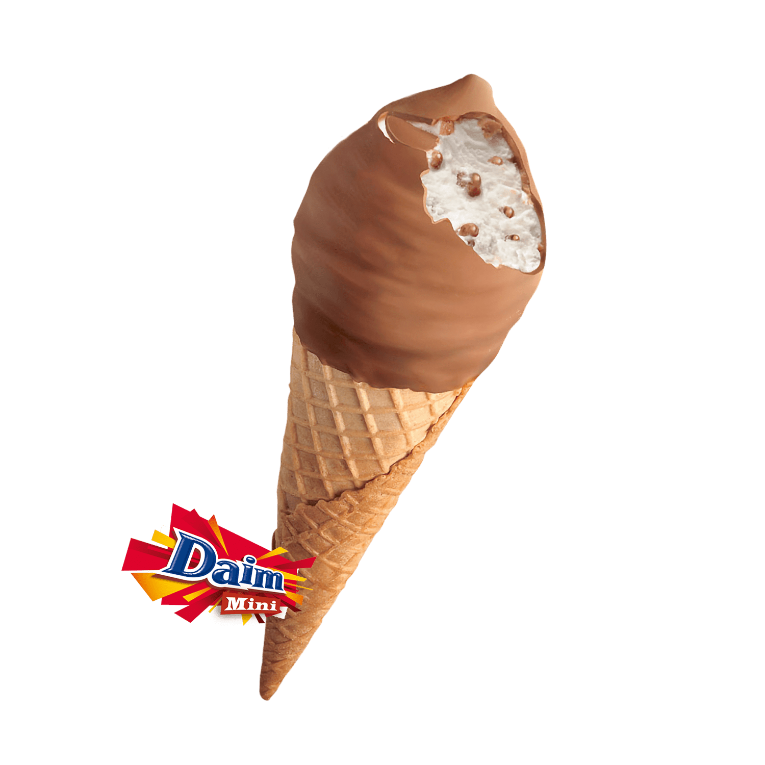 Glass med Daim-bitar (mjölkchokladdragerade bitar av mandelkrokant) (6%), våffla (21%), doppad i mjölkchoklad (12%