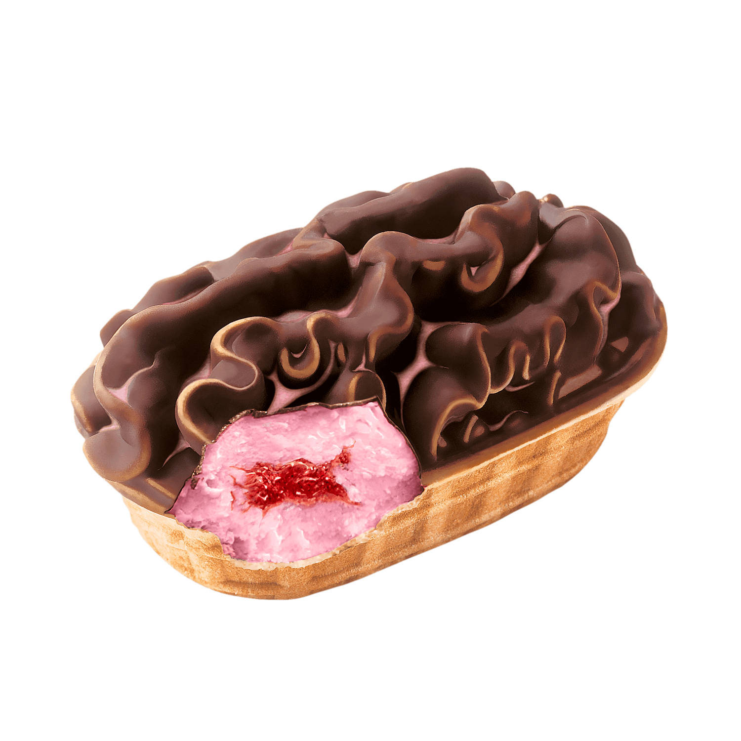 Hallonbåt – Gräddglass med smak av hallon, hallonrippel (13%), överdragen med kakaodopp (9%) i båtrån.
