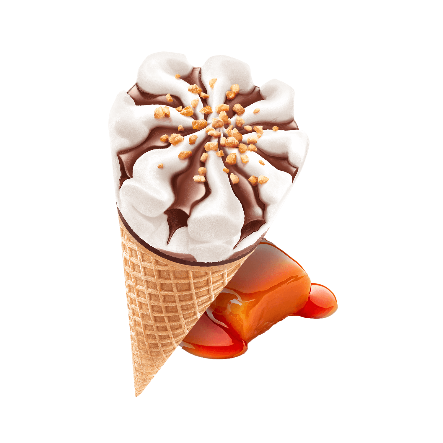 Våffelstrutar med bourbonvaniljglass, kakaohaltig fettglasyr (10%), karamellsås (8%) och hasselnötskrokant (2%)