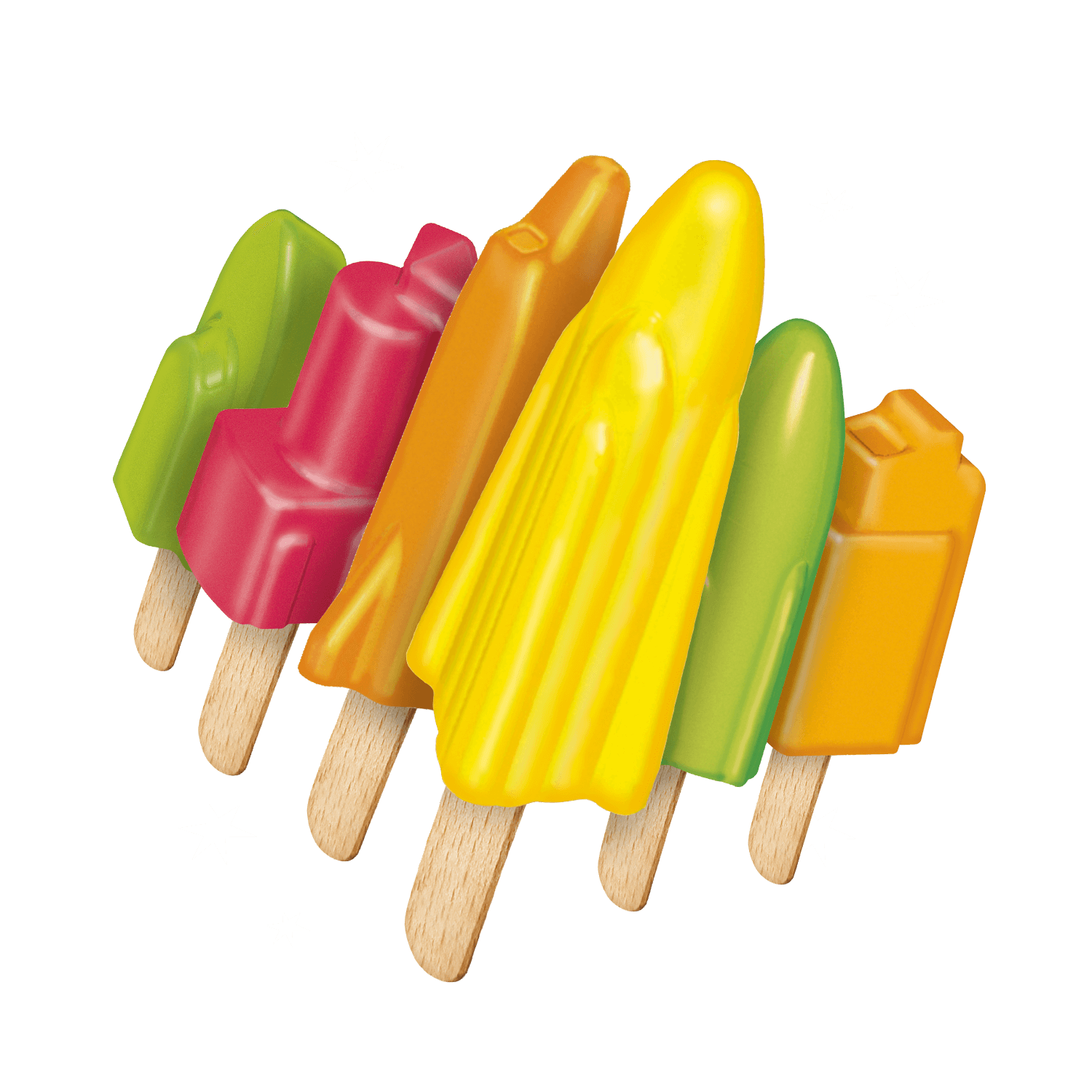 Glassar formade som olika maskiner med smak av apelsin, citron, jordgubbe, äpple, mandarin och lime.