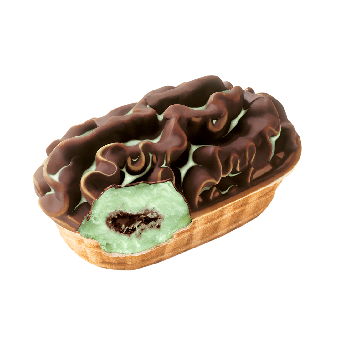 Laktosfri gräddglass med päronsmak och kakaofyllning, doppad i kakaomassa och båtrån!