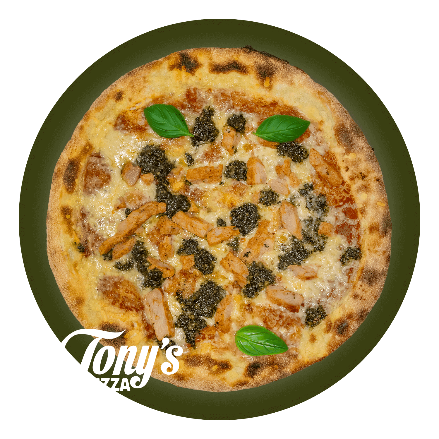 Tonys pizza kyckling pesto – En krispig pizzabotten toppas med kyckling och pesto