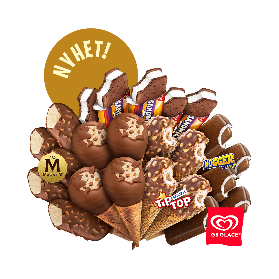 Ett stort lyxigt mixpack med stora klassiker från GB (fullstora glassar), Magnum, Tip Top, Nogger, Sandwich och nyheten Magnum Crunchy Salted Caramel.